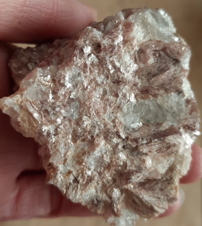 Laten we eerst kijken naar lithium houdende mineralen en gesteentes. We hebben er al een paar voorbij zien komen. Petaliet, spodumeen en lepidoliet zijn bekende lithium houdende mineralen. Deze komen vooral voor in pegmatiet. Pegmatiet is een gesteentesoort die gekenmerkt wordt door hele grote kristallen waaruit het gesteente is opgebouwd. De minerale opbouw is ruwweg gelijk aan die van graniet: veldspaat, kwarts en mica. Maar omdat pegmatiet in één van de laatste fases na afkoeling van magma vormt betekent dit dat het meeste magma al ‘leeg’ is, alle makkelijk kristalliseerbare elementen zijn al gebonden in graniet met de meest algemene mineralen, dus de veldspaten, kwarts en de mica’s. Wat overblijft is een waterige substantie. Het is geen dikke stroperige magma meer, maar ook geen water. Het zit er een beetje tussenin. In deze brij zitten alle elementen die in de gebruikelijke kristalroosters geen plekje hebben kunnen vinden, waaronder ons element lithium. Vaak zijn het elementen die niet zo makkelijk ‘passen’ in de meest voorkomende kristalstructuren en daarom overblijven. Vandaar dat veel van deze zeldzame elementen relatief geconcentreerd voorkomen in beperkte gebieden met dezelfde typen gesteentes. Uiteindelijk moeten die laatste elementen toch ook kristalliseren en vormen zich uit deze waterige magmarestjes mineralen die de wat zeldzamere elementen bevatten. Maar ook mineralen die erg groot kunnen groeien. Doordat de substantie waarin ze groeien redelijk waterig is kunnen ze zich makkelijker naar elkaar toe ‘bewegen’ en beter groeien. Zo zien we in deze afzettingen vaker grote kristallen. Pegmatietkristallen kunnen soms wel meters groot worden. In deze pegmatiet vinden we dingen als aquamarijn en andere beryl varianten, spodumeen, toermalijn, lepidoliet, topaas en granaat.
