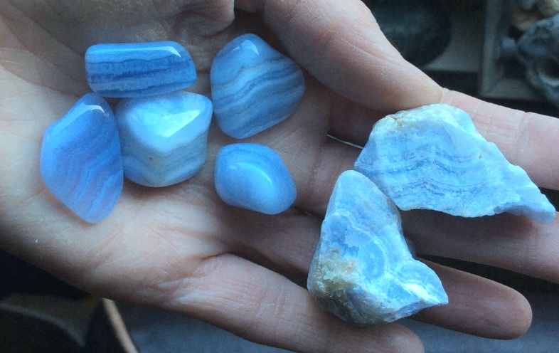 – Blue lace agaat wordt vaak blauwe chalcedoon genoemd, maar is wel degelijk agaat. Het wordt ook wel Avaloniet genoemd. In het Nederlands wordt dit soms kant-agaat of veter-agaat genoemd