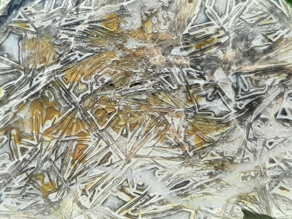 – Polyhedroid/polyhedral agaat is een bijzondere groei van agaat. Het zijn driehoekige agaten met rechte lijnen en scherpe hoeken. Ze ontstaan, naar men vermoed, doordat agaat groeit in holtes tuissen calciet of gips bladen. Deze calciet of gips is inmiddels opgelost en de driehoekige agaten blijven over.