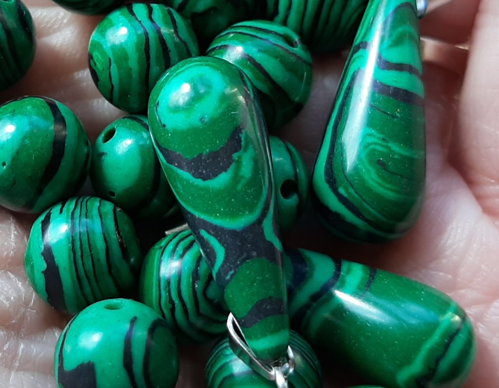 Fake malachiet: Dit is als je weet waar je op moet letten goed te herkennen. Kijk naar het beperkte kleurenpakket en de abrupte overgangen. Helaas de laatste tijd is het meer regel dan uitzondering dat er fake malachiet verkocht wordt, ook in Nederland. Je ziet nu zelfs blauwe, rode, paarse en oranje ‘malachiet’ kralen. Hier een video met meer uitleg.