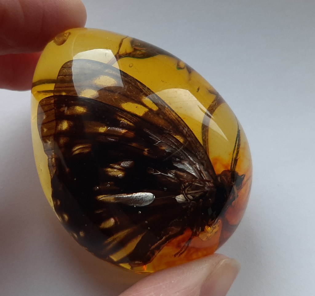 Grotere dieren in barnsteen zijn erg zeldzaam, die staan echt niet zo maar te koop. De paar die er zijn liggen vaak veilig in musea. En dieren die vast komen te zitten willen weer los komen. Dat kun je zien aan hoe ze in de barnsteen zitten. Vlinders gaan niet op hun mooist met hun vleugels gespreid op de hars liggen zodat jij een mooie vlinder in barnsteen hebt, die probeert zich uit alle macht los te wurmen. Soms is het erg lastig te zien of iets echt is, dan is een expert nodig om het dier te determineren. Insecten uit het Eoceen zijn nu eenmaal niet voorhanden, dus als het dier in de barnsteen recent is en nu voorkomt, is het stuk nep. Maar dat is lastig om zelf vast te stellen. Soms zie je ook een soort schelpachtige structuren, een soort discs in barnsteen. Vaak in juwelen. Dit betekent dat de steen echt is, maar dat het met hete olie behandeld is om het ‘schoon’ te maken, te ontdoen van onzuiverheden zodat het helderder wordt.