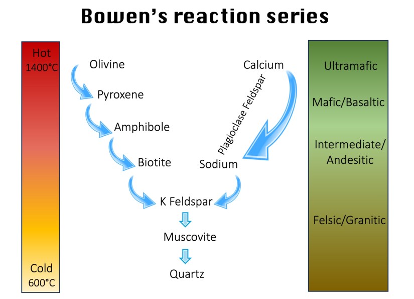 Stel je de letter Y voor. Er is één stam en er zijn twee armen. We beginnen bovenaan de linker- en de rechterarm. Dat is het heetste magma, de hoogste temperatuur waarop een mineraal stolt in de aardkorst. De linkerarm is een serie van opeenvolgende verschillende soorten mineralen die naarmate de temperatuur daalt afwisselend stolt. Deze arm is de zogenaamde ‘discontinuous series’, discontinue omdat er steeds een nieuw mineraal vormt. De serie begint met (ultra)mafisch magma, magma dat veel magnesium en ijzer bevat en relatief weinig silica. De rechterarm is de ‘continuous series’ en gaat over één en hetzelfde mineraal, plagioklaas veldspaat, met daarbinnen kleinere variaties. De zogenaamde veldspaat solid solution series. Dit is magma met minder ijzer dan de discontinuous series. Waar de armen bij elkaar komen in de stam vinden we de andere veldspaat serie, de alkali veldspaten. En ook een deel van de mica’s en helemaal onderaan kwarts.