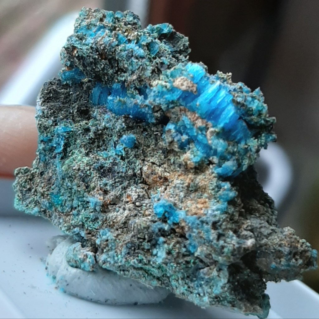 These vivid blue crystals often fade over time to a paler shade. With a bit of experience, it’s quite possible to learn how to distinguish between natural and synthetic chalcanthite, but one of the easiest clues is often the listed ‘locality’. If the specimen is said to be from Poland, for example, it is almost certainly lab-grown rather than naturally occurring.