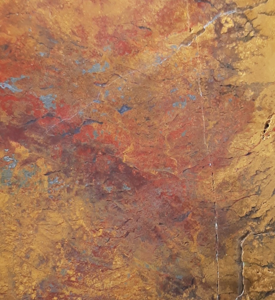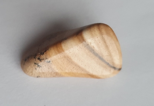 – Polychroomjaspis komt uit Madagascar. Het heeft allerlei mooie strepen, banden en figuren. Hoofdkleuren rood, bruin en geel. Wordt soms verward met mookaiet, maar dat is een hele andere steen.