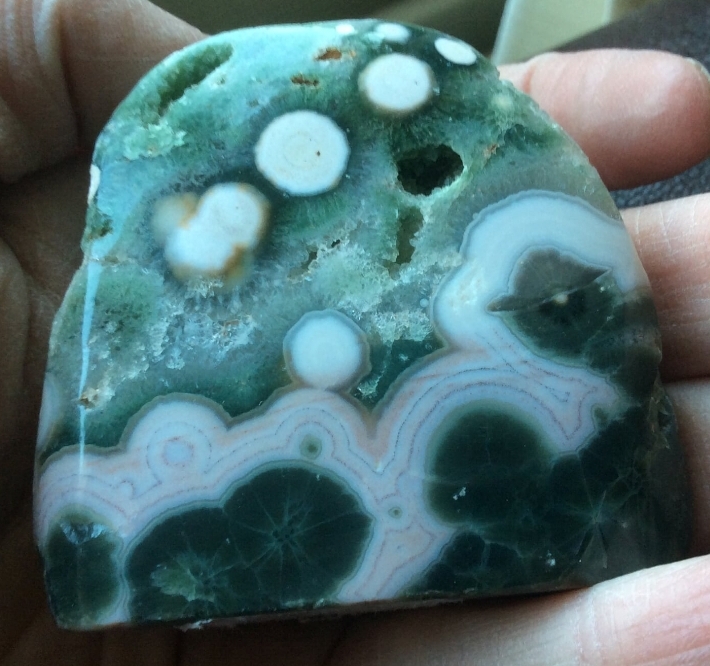 – Oceaanjaspis, dit is eigenlijk geen jaspis. Het is het sferisch of orbiculair gevormde chalcedoon in een soort ryoliet. Dit houdt in dat het in bollen groeit om een kern en dan samengroeit tot een gesteente. De cirkels die je ziet op stukjes oceaanjaspis zijn eigenlijk driedimensionale bollen chalcedoon. Dit kan de mooiste kleuren hebben en komt uit Madagascar. De naam Ocean Jasper is gepattenteerd door een mijn waar de mooist gekleurde exemplaren uit komen en mag als handelsnaam ook alleen gebruikt worden door die mijn van dat bedrijf. En is ook een andere mijn waar deze steen uit komt, daar verkopen ze het onder de naam Sea jasper, zeejaspis. Dezelfde steen dus.