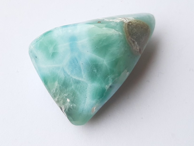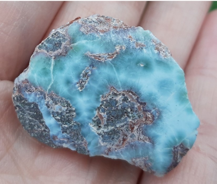 Larimar was discovered in 1916 by a Spanish priest. It is found in layers of volcanic rock containing basalt and tuff dating from the Cretaceous and Eocene periods. Larimar forms in hydrothermal veins within basaltic volcanic rocks. These veins developed when hot, mineral-rich fluids circulated through fractures in the volcanic host rock. Its formation is linked to tectonic uplift and faulting in the Caribbean plate boundary zone, which allowed fluids to move and minerals to precipitate. The surrounding rocks may also contain chalcedony, natrolite, hematite, calcite, apatite, sphene, datolite and prehnite. The colour of larimar ranges from almost blue-white to intense sea blue and blue-green. The exact cause of the colour is still not fully understood. Current scientific consensus suggests the blue colour is caused by trace-element substitution (most likely Cu²⁺, possibly combined with Mn or V) replacing calcium in the crystal lattice.The precise mechanism is still debated because the colour appears patchy and zoned, suggesting fluctuating chemical conditions during growth. Copper is present only in low concentrations.