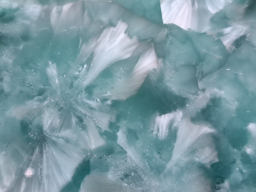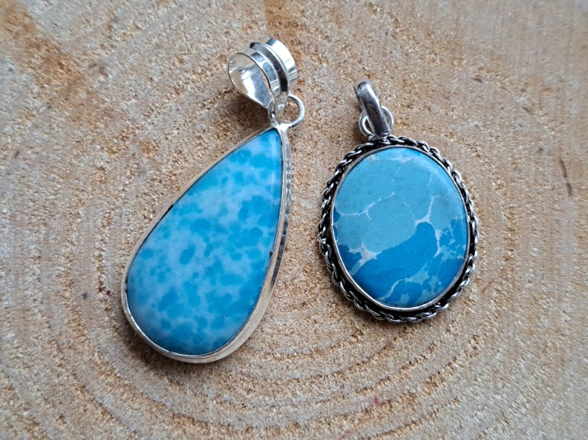 Because of its popularity and high prices, imitation varieties are increasingly appearing on the market. Blue hemimorphite and aragonite, as well as the man-made “Victoria Stone” (often referred to as Chinese larimar), are well-known substitutes. Clay pendants and dyed natural stones are also sometimes sold as larimar. In natural larimar, crystals are typically fibrous and radiating, which causes the characteristic cloud-like patterns. Porous material is sometimes impregnated to improve durability.
