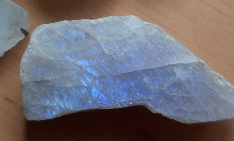 Een bekende namaak variant van maansteen is opaliet. Opaliet is glas dat door de mens gemaakt wordt en een mooie regenboogglans/kleur heeft. Het wordt zowel als maansteen alswel als opaal aangeboden. Een aantal websites beweren dat dit gesmolten of gereinigde opaal is, maar dat is een fabeltje. Deze video laat je zien hoe je het verschil kunt zien tussen opaliet, maansteen en opaal. Daarnaast kan maansteen geverfd worden. Het is redelijk poreus. Ik heb ‘regenboog’ maansteen gezien die echt in alle kleuren van de regenboog geverfd was. En ook de groene ‘garniriet’ maansteen wordt soms geverfd. Dit is te herkennen aan de opvallende felgroene kleur in met name de breuklijnen.