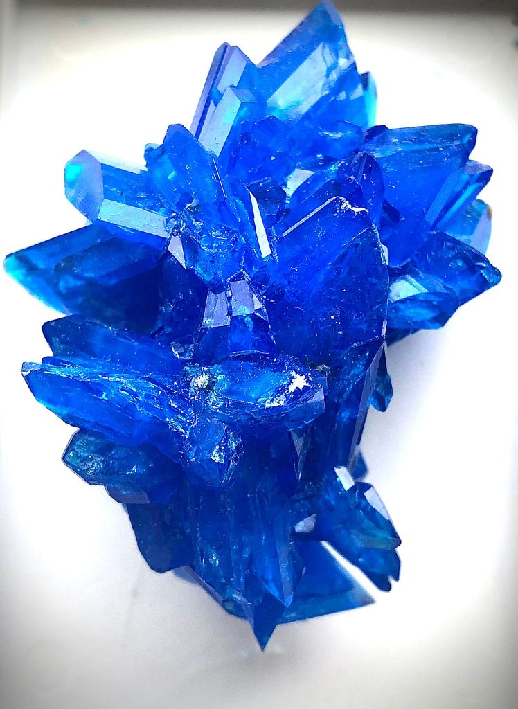 Chalcanthiet is een kopersulfaat mineraal dat gewoon in de natuur voorkomt. Een mooi, helderblauw kopermineraal. Maar helaas is de meeste chalcanthiet die je in winkels en op beurzen ziet de synthetische, laboratorium-geproduceerde variant. Felblauwe kristallen die na verloop van tijd verbleken naar een fletsere blauwe kleur. Een beetje oefenen leert je al snel natuurlijk van synthetisch te onderscheiden bij dit mineraal, maar de echte weggever is vaak de ‘vindplaats’. Als dit mineraal als vindplaats Polen of Bulgarije heeft, dan moet je er sterk van uit gaan dat dit een labgrown exemplaar is en geen natuurlijk stuk. En bovendien… zowel natuurlijke als synthetische exemplaren zijn niet heel goed voor je gezondheid, liever dus niet te veel aanraken en buiten bereik van kinderen houden. Vanwege hun mooie felblauwe kleur spreken ze juist kinderen erg aan. Opletten geblazen dus. Kan huidirritatie en oogirritatie geven en ook irritatie aan de luchtwegen. In oude scheikunde sets en ‘grow your own crystal’ set wil soms wel felblauw kopersulfaat poeder zitten. In poedervorm is het een stukje gevaarlijker, onder andere omdat het risico op inademing groter is. Eigenlijk is dit niet geschikt voor kinderen, terwijl die sets daar wel voor zijn bedoeld.