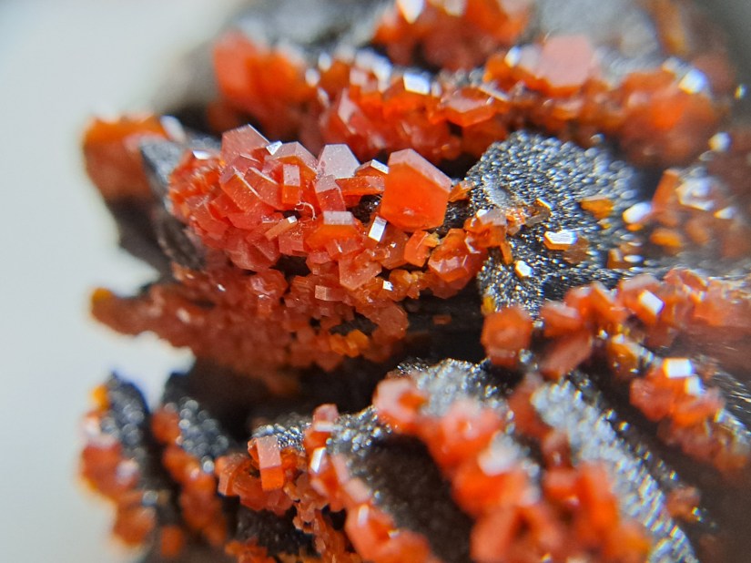 Vanadinite is a popular mineral with beautiful reddish-brown crystals, but vanadium is a toxic element. Handling vanadinite in normal circumstances is not a problem, but care should be taken when crushing it, and with exposure to moisture and acids, etc.