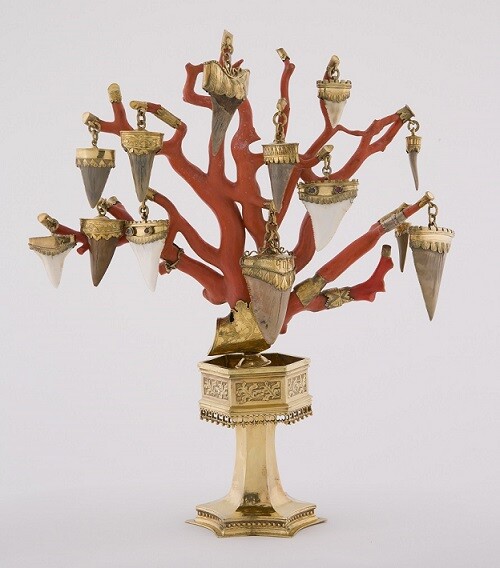 In the German-speaking world, these shark teeth were known as Zungensteine or Natternzungen, and the ornate stands that held them were referred to as Natternzungen-Kredenz. Several beautiful examples of these table ornaments have survived and are preserved in museums.