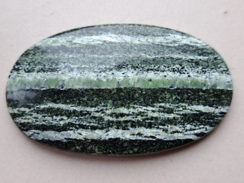 Serpentine is a group of minerals, chrysotile being one of them. Other well known members of this group are lizardite and antigorite. Most stones that are being called serpentine or ‘serpentine jade’ are actually serpentinite, a type of rock that consists predominantly of serpentine minerals. Serpentinite can contain chrysotile, which is a type of asbestos. Asbestos in serpentine is mainly concentrated in clearly visible bands/layers. Outside these layers it can occur in very small neglectable quantities. These asbestos layers do not occur in all types of serpentinite.
