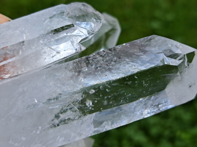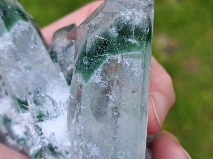 Gelukkig zijn er een paar dingen waaraan we deze lab-grown kwarts kunnen herkennen. De recente Chinese clusters zijn vrij uniform in uiterlijk. Ze hebben een witte cement basis van waaruit radiaal een aantal grote punten steken. Deze cementbasis en ook de (onderkant van) de punten zijn overgroeid met honderden piepkleine en soms vlijmscherpe kristalletjes. De kristallen zelf ogen op de lange vlakken wat slordig, ze bezitten niet de nette striatie (horizontale lijntjes) die een natuurlijke kwartspunt heeft. Op een lab-grown punt is deze striatie slordig of afwezig. Als je er tegenaan tikt klinkt het anders dan natuurlijke kwarts, meer glas-achtig.