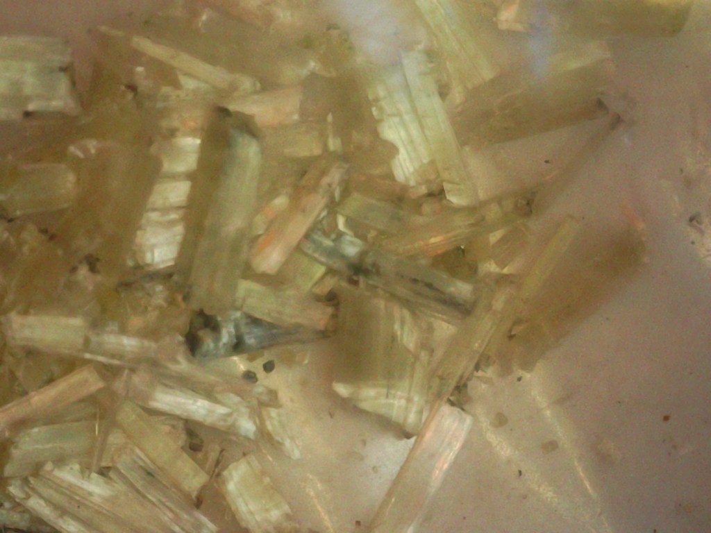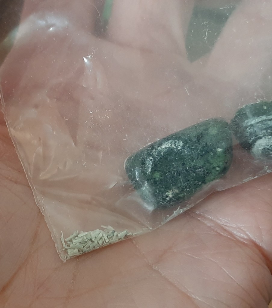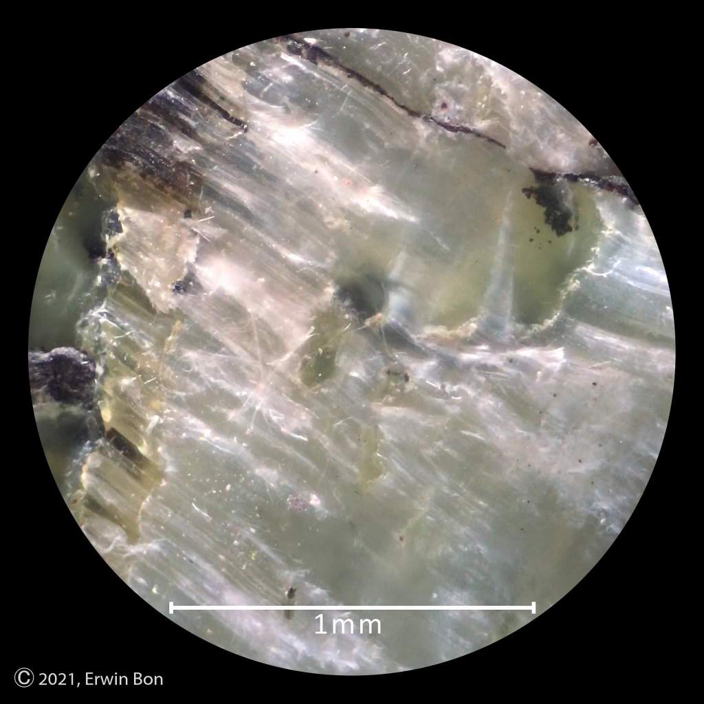 Chrysotiel is een asbestsoort. Soms wordt dit verkocht met de mededeling dat het gepolijst ongevaarlijk is. Dat klopt niet. Asbest is niet te polijsten, deze witte laagjes zullen dus nooit glad worden en kunnen na polijsten nog steeds potentieel vezels verliezen. Daarbij… wat als je de steen laat vallen of er barstjes inkomen? Zie de derde en vierde foto. Je ziet overduidelijk de losse asbestvezels zitten en je ziet ook dat er losgeraakte vezels op mijn hand liggen. Maakt niet uit of dit gepolijst of ruw is, het is asbest en dat is gevaarlijk en de verkoop ervan is verboden! Wil je meer lezen over asbest in mineralen, kijk dan hier.
